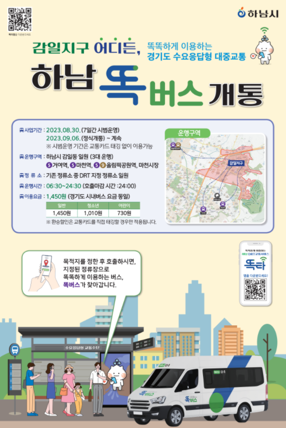 똑 버스는 경기도형 DRT의 고유 브랜드로 ‘똑똑하게 이동하는 버스’라는 의미다. 앞서 하남시는 이달 30일 똑 버스를 개통하기 위해 지난 6월부터 운송사업자를 모집·선정하고 차량과 승무사원을 준비하는 등 사전 작업을 철저히 이행했다.