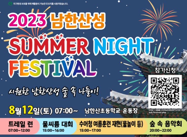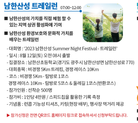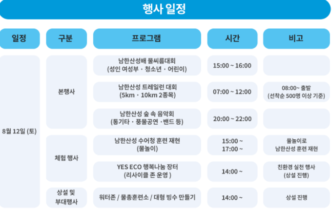 남한산성의 가치를 직접 체험하고 지역 상권 활성화와 남한산성 환경보호 문화적 가치를 배우는 트레일런과 수어청 훈련 재현 남한산성 숲 속 음악회 남한산성 물씨름 대회 행복 나눔 장터 대형 빙수 만들기 등 다양한 볼거리 놀거리가 준비되어 있다 특히 눈길을 끄는 것은 행복 나눔 장터에서 친환경 문화행사를 한다고 한다 플라스틱 리사이클 존을 운영 플라스틱 수거 및 재활용 과정을 체험할 수 있는 프로그램으로 자녀들과 함께 하면 좋은 경험으로 아이들도 새로운 경험과 환경보호에 참여하는 좋은 기화가 될 것으로 생각된다