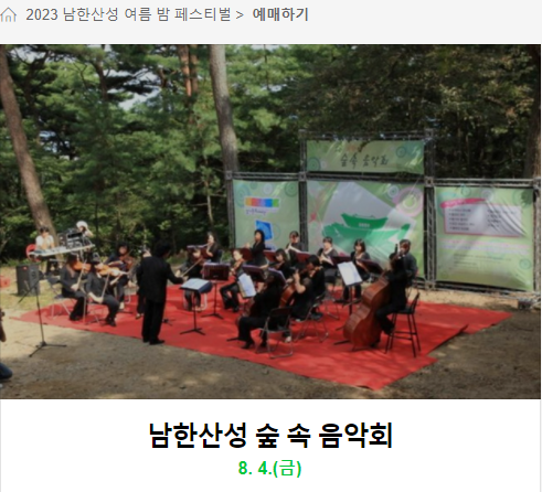 3. 남한산성 숲 속 음악회 여름 달빛과 어우러지는 음악회로 다양한 계층과 함께 할 수 있는 음악으로 진행하며 세께 문화유산 남한산성에서 추억과 아름다운 선율을 숲 속 음악화로 즐길 수 있다