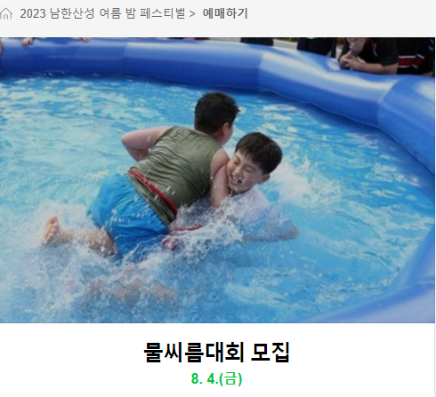 4. 남한산성 물씨름 대회 성인 남녀 학생 분야별 물씨름으로 무더운 여름 가족단위 관광객 대상 시원한 즐거움을 선사한다