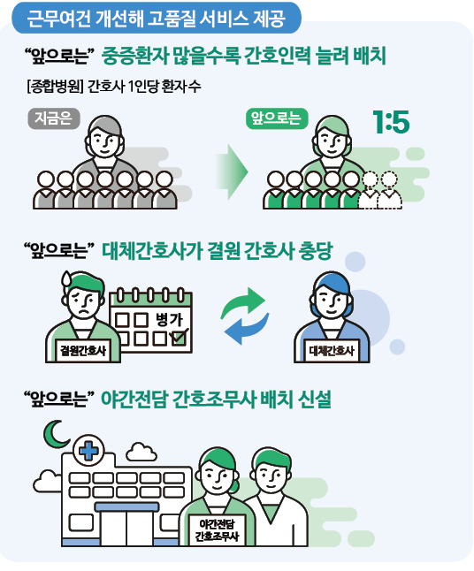 간호 조무 조무사를 최대 3.3배로 늘려 배치할 예정이며 1인당 해야 하는 환자 수를 30~40명에서 12~20명 기준으로 국민이 받는 서비스의 질을 높이기 위해서라고 할 수 있겠습니다.