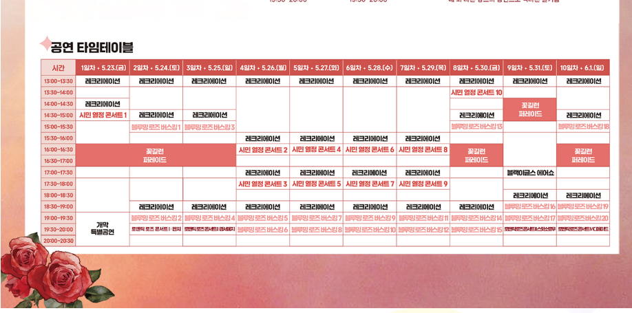 꽃길런 퍼레이드: 장미요정과 함께하는 퍼레이드로, 사전 신청한 관광객이 직접 참여할 수 있습니다.