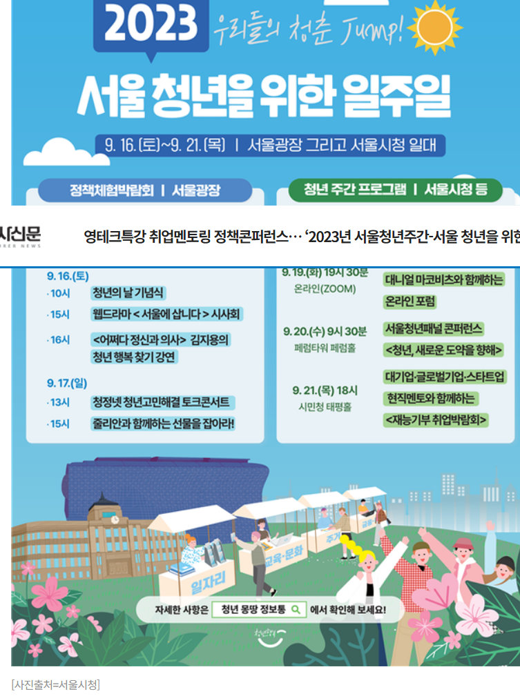 서울에서는 청년의 날을 맞아 9월 16(토)부터 21일(목)까지 2023년 서울청년주간 서울청년을 위한 일주일 행사가 개최됩니다 청년에게 꼭 필요한 영테크 특강부터 청년정책을 논의하는 다양한 프로그램이 진행된다고 하니 청년분들은 꼭 참석해 보세요