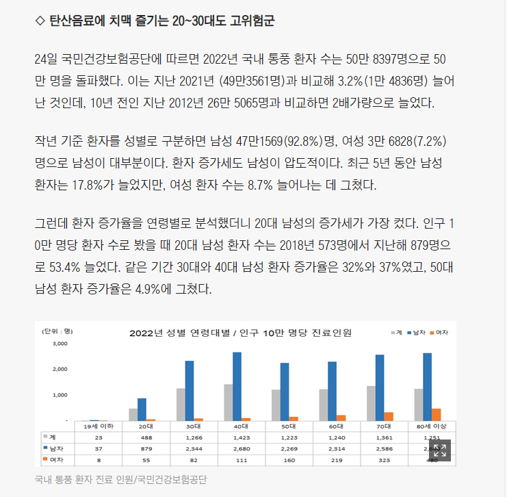 여성 통풍 환자도 20대 증가율이 두드러졌다. 인구 10만 명당 20대 여성 환자 수는 같은 기간 41명에서 55명으로 34% 늘었다. 30대와 40대 여성 환자 수 증가율은 각각 20%와 6.7%로 나타났다. 통풍은 요산을 분해하는 능력이 떨어지면서 생기는 병이기 때문에 나이가 들면 환자가 늘어나는데, 같은 기간 60대 이상 고령층 환자 숫자는 남녀를 불문하고 오히려 5~7% 줄었다.